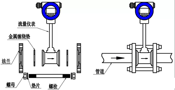 (3)在法蘭的內(nèi)槽內(nèi)裝上與管道通徑相同的密封墊圈,將流量計裝入法蘭中,壓縮空氣流量計的流向標(biāo)應(yīng)與流體方向相同,然后用螺栓緊固好。
