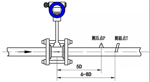 注:測壓孔和測溫孔的安裝設(shè)計。被測管道需要安裝溫度和壓力變送器時,測壓孔應(yīng)設(shè)置在下游3-5D處,測溫孔應(yīng)設(shè)置在下游6-8D處。