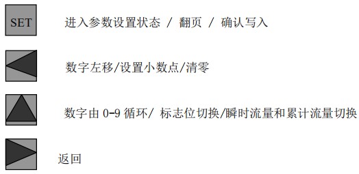 設(shè)置小數(shù)點(diǎn):直接按 SET 鍵確認(rèn),進(jìn)入默認(rèn)流量參數(shù)設(shè)置菜單,顯示屏顯示 QP,按數(shù)字↑ 鍵設(shè)置標(biāo)志位。按數(shù)字← 鍵設(shè)置小數(shù)點(diǎn),按→鍵可以返回菜單選擇項(xiàng)。