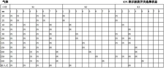 以上表值僅供參考,實(shí)際使用中因液體粘度和氣體密度不同應(yīng)在此值附近調(diào)整,頻率低時(shí)可將 K3 向大口徑方向調(diào)一至三檔。頻率高時(shí)可將 K2 向小口徑方向調(diào)一至三檔。