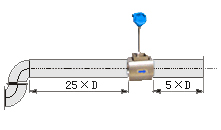 若傳感器安裝點(diǎn)的上游在同一平面上有二個90°彎頭,傳感器上游應(yīng)有不小于25D的等徑直管段,下游應(yīng)有不小于5D的等徑直管段。